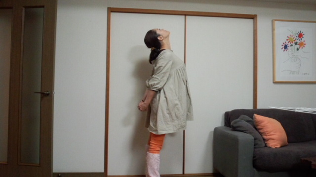 ①手を後ろで交差させて握る。肘が痛い方は手を組むだけで大丈夫。